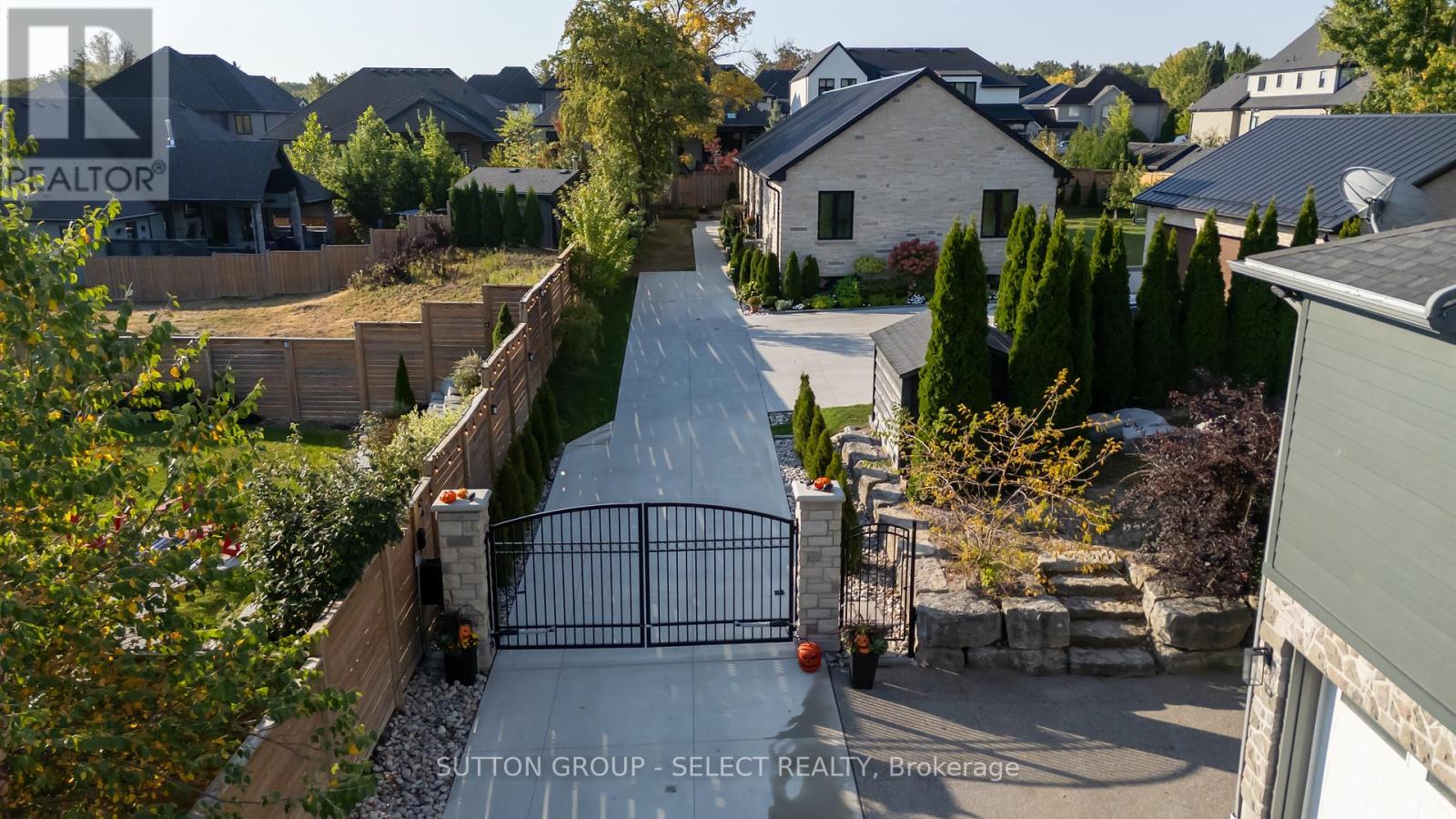 Understated executive bungalow, set intentionally back from the road, behind the mystique of automated privacy gates, creating the English stone-cottage inspired residence found wrapped in trees, tranquility, and quiet prestige. A long, softly illuminated, concrete drive draws you away from traffic to a quiet fully fenced, pool-sized lot, with abundant guest parking and a separate 3-car garage. The timeless stone exterior, romantic Juliette balconies, and partially covered verandah set the stage for refined outdoor living, anchored by a two-sided fireplace that invites lingering evenings and effortless entertaining. Inside, soaring 10-ft ceilings on the main level and 9-foot ceilings in the lower level create a sense of volume and light for this modern-European aesthetic. The main floor unfolds in a thoughtful 2-bedroom plus den layout that balances intimacy and openness, centred around a showpiece kitchen with ceiling-height flat-panel cabinetry, quartz surfaces, and a wet bar/servery with garden door access to the terrace. Scandinavian-inspired baths and a serene, boutique-style primary suite complete the upper level with quiet sophistication, while the den adapts easily as a third bedroom. The lower level is equally impressive and remarkably versatile, offering 3 additional bedrooms, 2 bathrooms, a full second kitchen and laundry, and expansive living areas filled with natural light. Whether envisioned as a seamless extension of the main home, a private guest or teen retreat, or an elevated work-from-home, the possibilities are exceptional. Notably, there are no interior load-bearing walls on this level, allowing easy removal of fireplace and island to create an exceptional flex/games/media space. A metal roof, 3-bay garage w/ 220-amp service & the rare setback position complete this private, design-driven residence delivering beauty, presence, and flexibility in equal measure-quietly tucked away, yet moments from Hospitals, Wortley Village, and Highland Golf. (id:60351)