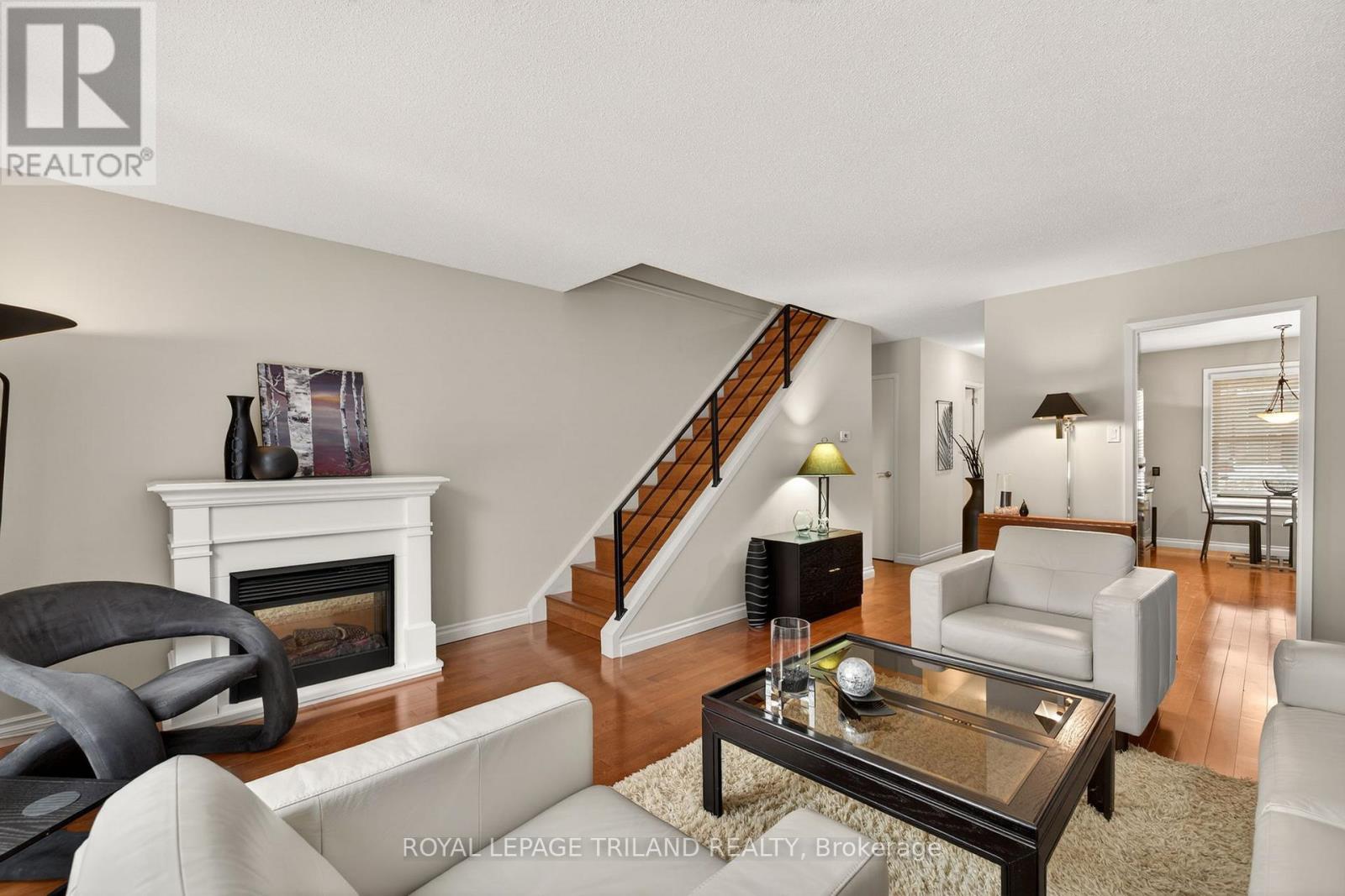 Immaculate & Refined Living. Where sophistication meets function; this immaculate residence feels like stepping into a boutique hotel. Thoughtfully chosen wall tones create a warm, calming ambiance throughout, complemented by pristine hardwood flooring on the main and second level. This 2-bedroom, 1.5-bath home offers an effortless blend of style and comfort. The sultry kitchen is both striking and practical, featuring a tile backsplash, sleek ebony cabinetry, and a seamless flow into the open-concept, airy, living area, flooded with natural light. Perfect for dining, entertaining, or relaxing. A glazed patio door and over sized windows overlook a private patio that extends to tranquil green space, offering a rare sense of seclusion on a preferred lot. Upstairs, the bright and spacious bedrooms provide peaceful retreats, with a full wall of closets in the primary. The second bedroom easily adapts as a family room, home office, or study. The lower level adds versatility with a cozy den, along with a generous laundry and storage area. Lovely gardens grace both the entrance and patio, setting the scene for morning coffee or an intimate evening outdoors. Completing the property, is the rare convenience of an assigned parking space directly at the front door. A serene, stylish condo designed for modern living. (id:60351)