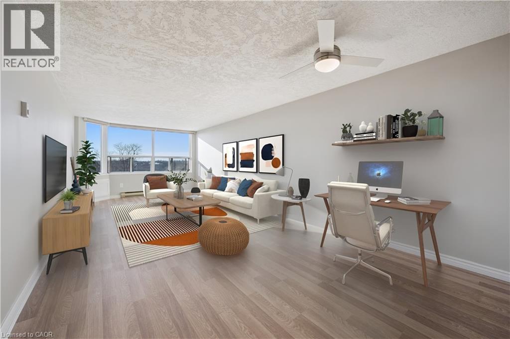 Bright and spacious 1 bedroom condo with an eat-in kitchen, updated bathroom, freshly painted with new flooring! Excellent view of all the amenities walking distance away such as grocery stores, resturaunts, Pioneer Plaza, Conestogo College and more, plus steps away from gorgeous green space and walking trails along the Grand River. Take advantage of a maintenance free lifestyle with low condo fees including water, and excellent building amenities including a sauna, gym, pool, games room, bike storage and secure entry. No need to scrape ice this winter as this unit offers COVERED parking for your vehicle plus visitor parking for guests. With new windows and ample space for a home office, this unit is perfect sanctuary to work from home. Enjoy the comfort and convenience of in suite laundry and a spacious kitchen with a dishwasher and ample cabinet and countertop space. Ideally located minutes from 401 access and public transit this condo is an excellent choice for first time buyers, downsizes or investors alike. (id:60351)