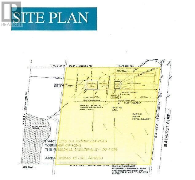 5-Acre Parcel, Frontage 340 ft x 660 ft of depth, Rare Commercial Investment Opportunity, Bathurst St. & King Rd. in Richmond Hill. The property is improved with an existing approximately 4,000 sq. ft. two-storey commercial building featuring equipment storage, four drive-in doors, approximately 100,000 sq. ft. asphalt yard, ample exterior lighting, and a 28-ft access gate. An approved permit is in place for an additional approximately 4,600 sq. ft. storage building. Ideal opportunity for investors, agricultural operators, owner-users, or land bankers seeking strategic long-term appreciation in a high-growth corridor. Don't miss this exceptional opportunity. Purchasers are advised to conduct their own independent due diligence regarding development potential, timelines, and permitted uses. (id:60351)