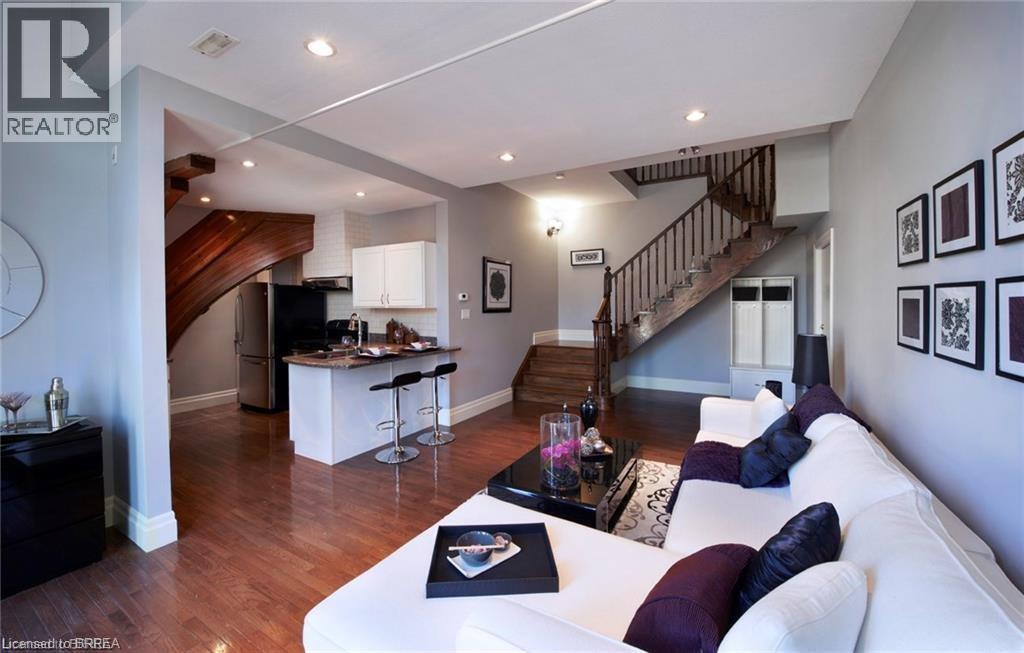 Have you ever wanted to live in an old church, of course fully converted and renovated to high heaven? Located in the heritage district on Brant Ave, you are minutes from the 403, shopping, parks, the trails, and of course the Grand River. This one bedroom unit is absolutely stunning. The primary bedroom will leave your jaw on the floor, and the cozy vibes are felt the moment you step inside. Just under 1,000 square feet, this loft-style home is filled with character and natural light. The great room impresses, original windows, and rich hardwood floors that ground the space while still letting it feel bright and airy. Thoughtful attention has been paid to preserving the charm of the original building while seamlessly blending in modern finishes. The Bathroom and bedroom have been renovated giving the vibes of living in a boutique hotel. The kitchen is stylish and functional, with granite countertops, and stainless steel appliances. A breakfast bar anchors the space, perfect for casual meals, entertaining, or enjoying your morning coffee. The hardwood flooring continues throughout, creating a polished feel. The wood staircase is a statement all on its own, leading to a landing that works perfectly as a home office or study area. Continue upstairs and you will find an impressive loft bedroom with plenty of closet and storage space. The view overlooking the great room adds to the uniqueness of the space, making it feel truly special. A clean and timeless four piece bathroom completes the upper level. Centrally located near trails, golf, parks, museums, the library, and close to both Wilfrid Laurier University and Conestoga College, this is carefree condo living at its best. Ideal for a busy professional or an active downsizer who wants something unique, low maintenance, and full of character. This is not just a place to live. It is a lifestyle with history, warmth, and undeniable presence. Don't delay, call your REALTOR® today. (id:60351)