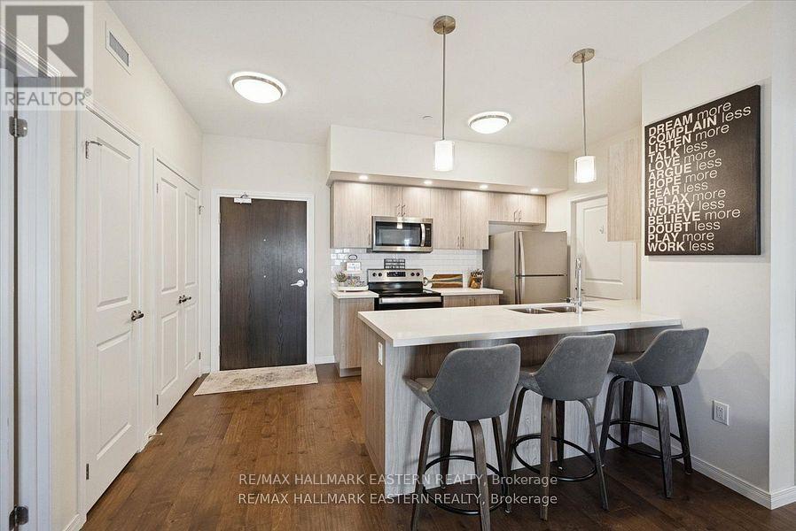 **Watch The Reel - Press Play & Fall in Love!!** This Condo Has It All - Peterborough's Premier West-End Community! Located in the prestigious Jackson Creek Meadows neighbourhood on the edge of the city, this modern condominium offers the perfect blend of convenience and style. Situated on the first level, this 2-bedroom, 2-bathroom unit comes with 1 parking space and visitor parking. Inside, you'll find an open-concept layout designed for comfort and entertaining. The kitchen features quartz countertops, modern lighting, pot lights throughout, an island with seating, and a pantry for extra storage. The living room walks out to an oversized balcony. The primary bedroom includes a walk-in closet and a private ensuite with a glass shower. A separate laundry room adds practicality and convenience. Additional highlights include: gas furnace, central air, Bell Fibre internet, and so much more! Don't miss this move-in-ready condo in one of Peterborough's most sought-after locations! Come take a look and make this beautiful space yours today. (id:60351)