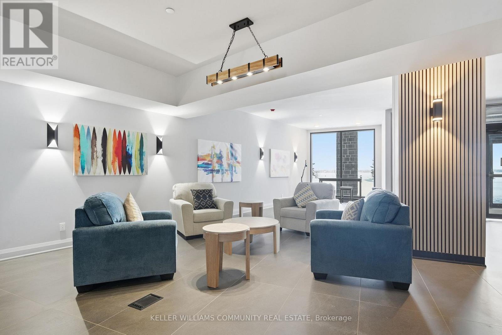 Welcome to Unit 206 at The Moorings on Cameron Lake, where refined condo living meets the calm and beauty of waterfront life. This spacious 2-bedroom, 2-bathroom suite offers approximately 1,063 sq ft of thoughtfully designed interior space, plus a stunning 39-foot covered balcony providing an additional 250 sq ft of living space, all overlooking Cameron Lake. Perfect for relaxing, entertaining, or enjoying unforgettable sunrises over the water. Inside, the suite features 9-foot ceilings, expansive windows, and quality finishes throughout, creating a bright and welcoming atmosphere. The open-concept living and dining area flows seamlessly into the modern kitchen, ideal for both everyday living and hosting guests. The primary bedroom includes a private ensuite and generous closet space, while the second bedroom and full bathroom offer flexibility for guests, a home office, or comfortable everyday living. In-suite laundry adds to the convenience of this well-designed home. Residents of The Moorings enjoy exceptional resort-style amenities designed to support both relaxation and an active lifestyle. The third-floor owners' lounge features breathtaking lake views and includes a full kitchen, dining areas, cozy fireside seating, and a private theatre room, perfect for entertaining. The fitness centre is equipped with cardio and weight machines change rooms, a dedicated yoga and pilates studio, and a cedar sauna. Additional conveniences include a pet cleaning station, ideal for dog owners after lakeside walks or outdoor adventures. Outdoors, residents can enjoy a heated pool and spa, tennis and pickleball courts, a landscaped lakeside courtyard, and waterfront docking with swimming and lounging platforms. Located on the shores of Cameron lake in the heart of Fenelon Falls, this condo offers the perfect balance of nature and walkable small-town charm! (id:60351)