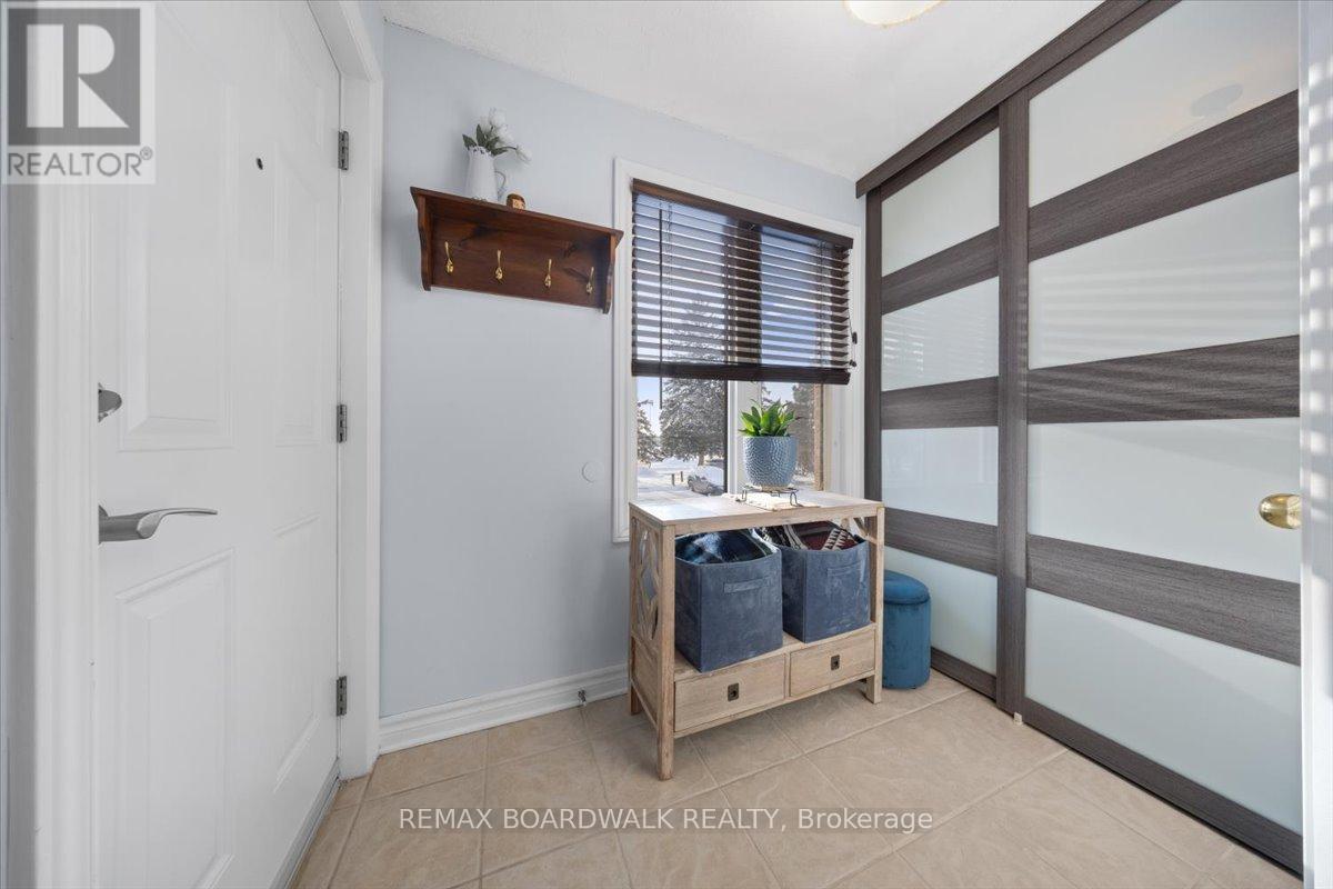 Low-maintenance living in the desirable community of Convent Glen North. A covered front entrance welcomes you into a tiled foyer with ample closet space and a convenient powder room (2019). Hardwood flooring runs throughout the main level, complemented by large windows and sliding patio doors that fill the space with natural light.The updated kitchen (2024) is designed for both function and appeal, featuring white shaker soft-close cabinetry, a calming horizontal blue backsplash, deep quartz countertops, and an extended breakfast bar. The living area offers a cozy focal point with a stone electric fireplace (2025) and peaceful views of the rear green space with no direct rear neighbours.PVC fencing and mature trees create a private, tranquil outdoor setting. Down the two-tone staircase, the lower level remains bright with large egress windows at both the front and back. The primary bedroom features a full-width, wall-to-wall closet, while the updated 4-piece main bathroom (2019) includes a large vanity and tiled tub surround with soaker tub.Laundry is conveniently located on the lower level, along with additional storage. Ideally situated close to walking paths, schools, OC Transpo, grocery stores, and everyday amenities. Pride of ownership throughout in a family-friendly neighbourhood. (id:60351)
