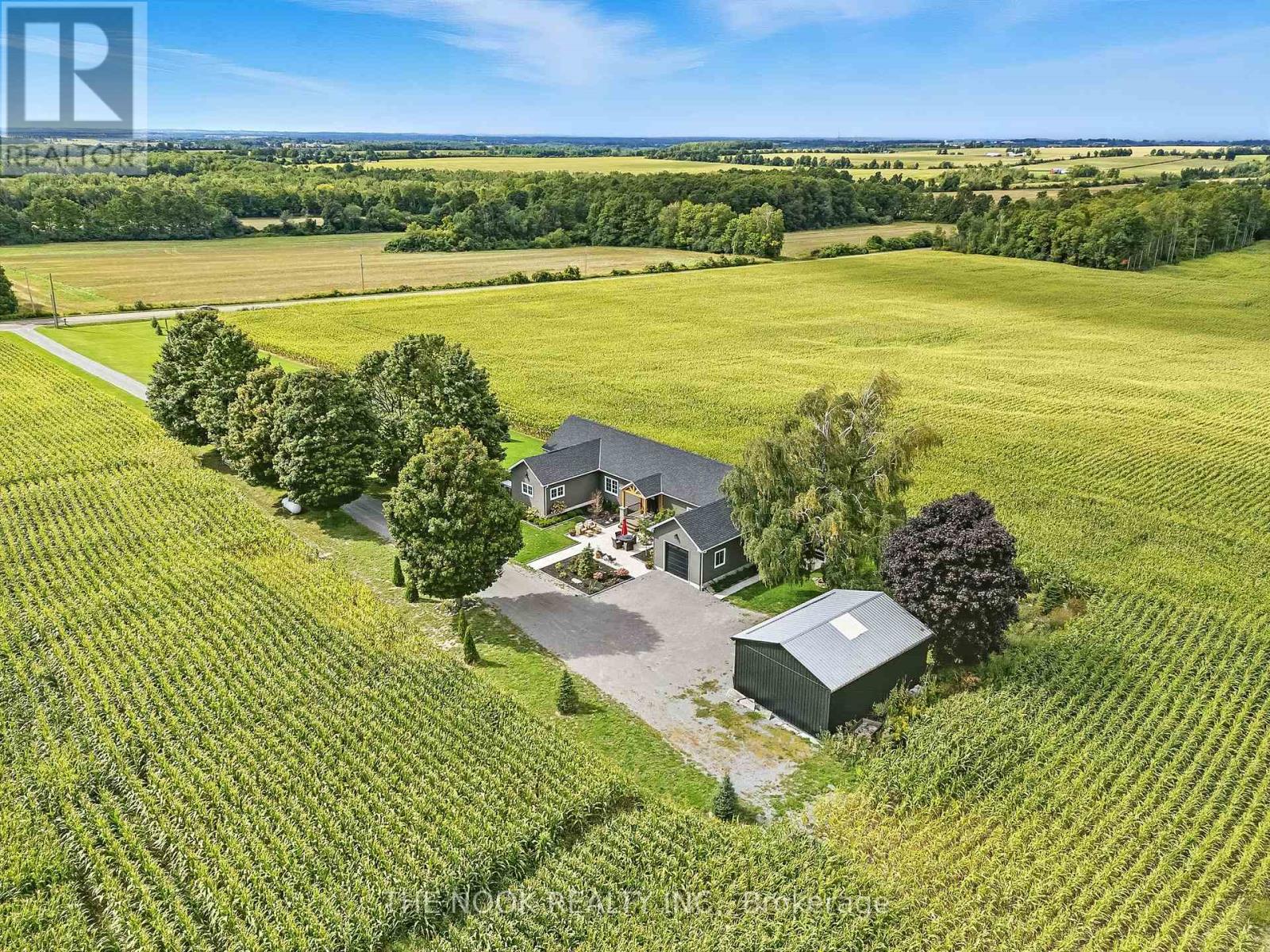 Welcome to this custom-built luxury bungalow on 1.54 acres of private countryside, offering modern comfort with timeless rural charm. A tree-lined driveway leads to beautifully landscaped grounds, a welcoming front porch, & multiple outdoor living spaces, including a raised deck & spacious patio for entertaining. The main level of this home is thoughtfully designed to combine everyday functionality with elegant style. A welcoming foyer with a double closet leads into the open-concept living spaces, where soaring ceilings with wood beams, expansive windows, & a striking fireplace create a bright & inviting atmosphere. The chefs kitchen is a true highlight, featuring high-end appliances, custom cabinetry, a large centre island, & a walkout to the deck. Seamlessly connected, the dining area & living room provide an ideal setting for gatherings, with natural light flooding the space from every angle. The primary retreat offers built-in cabinetry, a luxurious 5-piece ensuite with soaker tub & glass shower, & private access to the deck. A second bedroom, currently staged as a home office, adds convenience for guests. Completing the main floor is a well-equipped laundry & mudroom with direct access to the attached garage. The fully finished lower level extends the living space beautifully. A wide staircase with glass railing opens to the rec room, complete with a sleek wet bar, custom built-in shelving, & a cozy fireplace. A glass-enclosed gym provides a dedicated space for fitness while maintaining an open, modern feel. Two generously sized bedrooms, each with large above-grade windows, are complemented by a stylish 4-piece bathroom. The lower level offers the ideal blend of relaxation, recreation, & practicality, while also housing a utility room for added convenience. With an attached garage plus a detached workshop, this property is ideal for both relaxation & practicality, all while surrounded by sweeping farmland views & just minutes from nearby amenities. (id:60351)