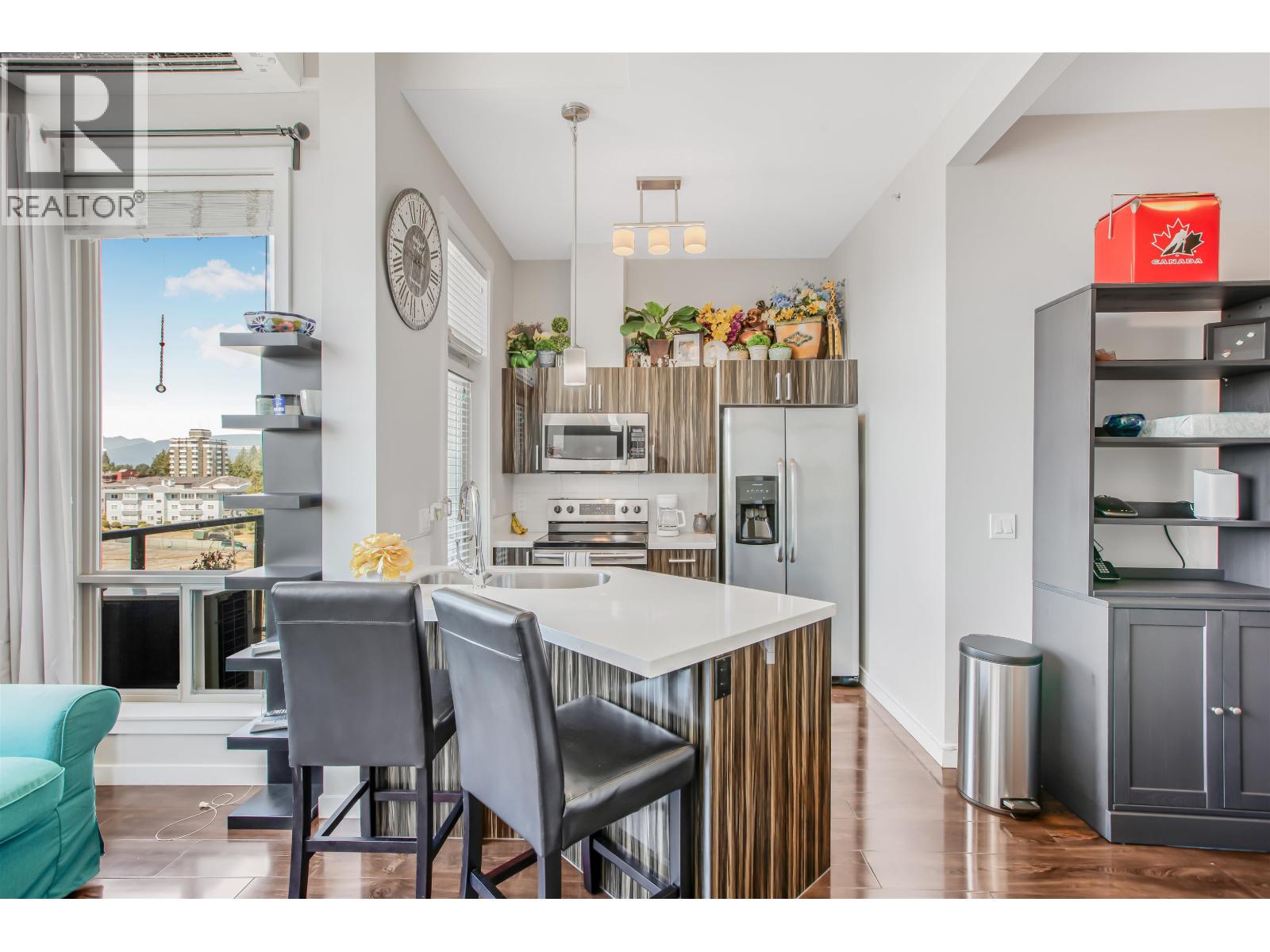 Welcome to 223rd North! Come checkout this unique, lovely 1 Bed Studio Penthouse in Downtown Maple Ridge with up to 14ft vaulted ceilings! Built in 2013, this unit come with White Quartz Countertops, Stainless Appliances, luxury thick dark mahogany coloured laminate flooring, built-in Electric fireplace & a Strata Approved professionally installed Air-Conditioning/heat-pump unit to keep you cool in the summer and warm in the winter. Unobstructed South, South-West, North-West views. In-suite Laundry and tons of closet space for all your belongings. Absolutely in perfect condition. An ultimate walk-score of 96 with Walmart, Haney Place Mall, Acts Centre, Leisure Centre, Club 16 Fitness, Banks and Restaurants with Beckett/Dog Park 100m away. (id:60351)