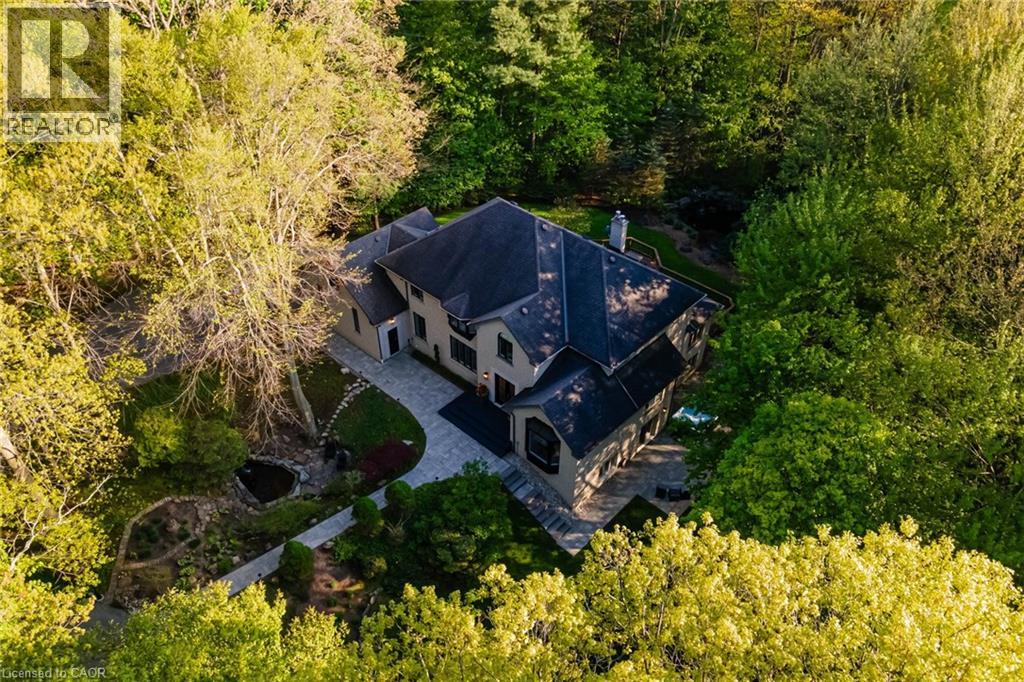 Experience unparalleled luxury in this fully renovated, nearly 7,000 sqft custom-designed executive home on a stunning 2.5-acre property in one of Ancaster’s most exclusive enclaves. Surrounded by nature yet minutes from city conveniences, this home blends upscale living with serene privacy—you have to see it to believe it. New stone walkways and lush greenery create exceptional curb appeal. Inside, every detail has been meticulously crafted to maximize space and functionality. Upon entering, you're immediately captivated by the grand 'Scarlett O’Hara' staircase. The main level boasts formal living and dining areas, a private office, and two powder rooms. The spacious custom laundry/mudroom features garage access and a second staircase to the basement. The elegant family room is a true focal point, with a Valor gas fireplace and a stone feature wall. The gourmet eat-in kitchen is equipped with top-of-the-line appliances, custom cabinetry, granite countertops, and stone accents. Rich hardwood, marble tiles, and high-end fixtures flow throughout. Upstairs, the primary suite is a private oasis featuring a spa-inspired 5-piece ensuite with a curbless glass shower and a deep soaker tub, as well as an expansive walk-in dressing room with custom built-ins. Three additional bedrooms and two beautifully updated baths complete the upper level. The newly renovated walkout basement is the ultimate entertainment hub, offering a fifth bedroom, full bathroom, and a stylish kitchenette or wet bar. Relax in the media area with a Valor fireplace or workout in the state-of-the-art gym. Step outside to a private patio with a hot tub—perfect for unwinding in nature. This level also offers excellent in-law suite potential. Outside, serene ponds and breathtaking views create a peaceful, cottage-like atmosphere. A multi-tiered deck extends the home’s living space, ideal for dining and entertaining. The expansive yard completes this one-of-a-kind luxury retreat. (id:60351)