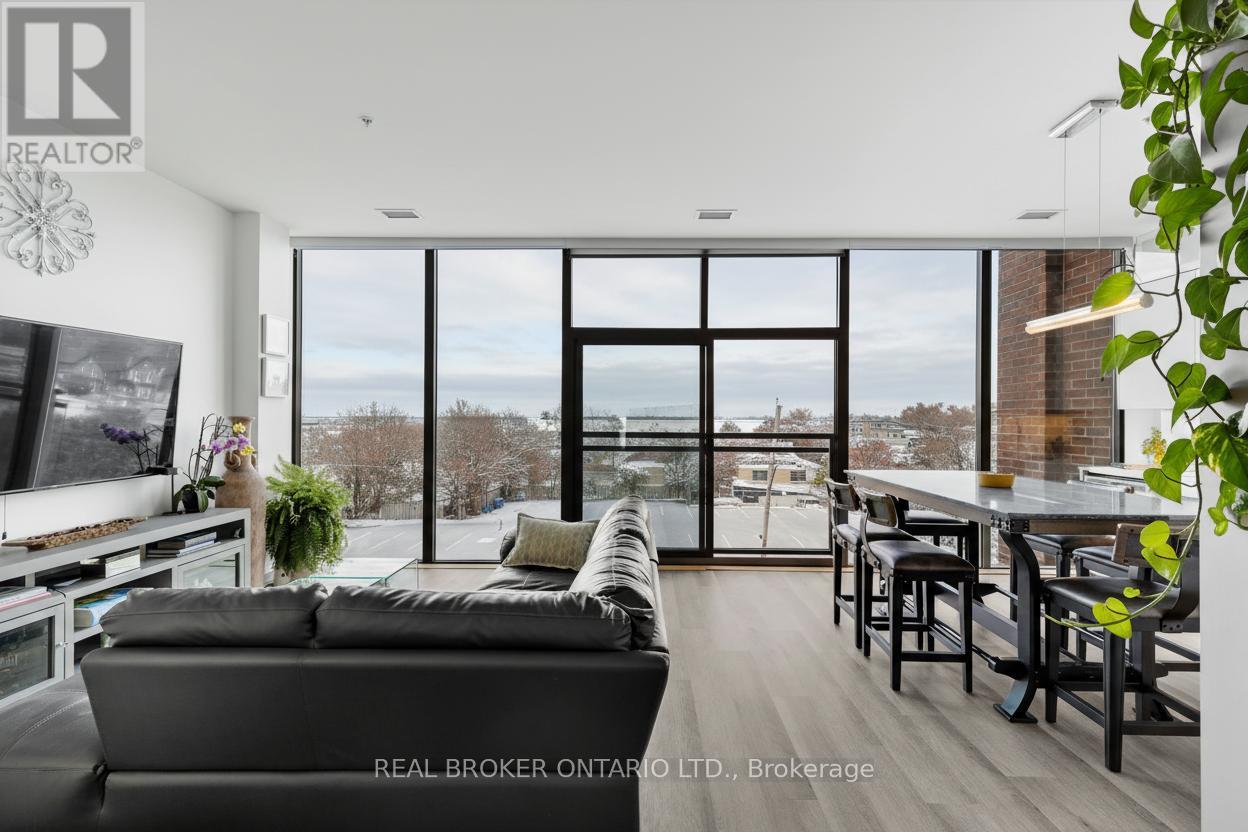 Water View! Discover the best of downtown living at Matchedash Lofts in Orillia. This bright and inviting 3rd-floor unit combines contemporary design with everyday comfort in one of the city's most sought-after buildings. Floor-to-ceiling windows and a Juliette balcony showcase stunning views overlooking Lake Couchiching and the city below.The open-concept layout features a spacious one-bedroom plus den design with two full baths. Den could also be used as a bedroom. The kitchen offers clean lines and quality finishes, featuring stainless steel appliances, a tile backsplash, stone countertops, and ample cabinetry for extra storage. The primary bedroom includes a walk-in closet and a private ensuite with beautifully tiled finishes. Matchedash Lofts residents can enjoy access to the rooftop patio with panoramic lake views, underground parking, and a bonus storage locker. Located just steps from Orillia's vibrant downtown shops, restaurants, waterfront trails, and parks - this thoughtfully designed condo offers an unbeatable blend of style, convenience, and lifestyle. (id:60351)